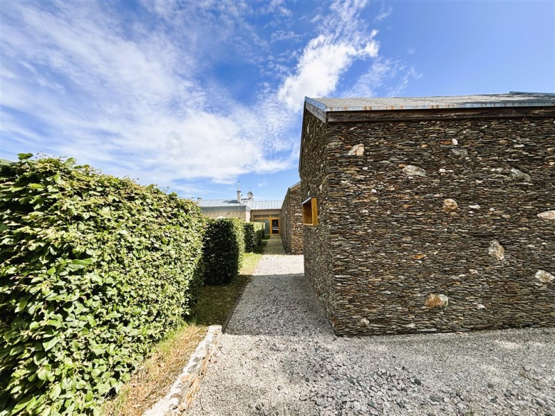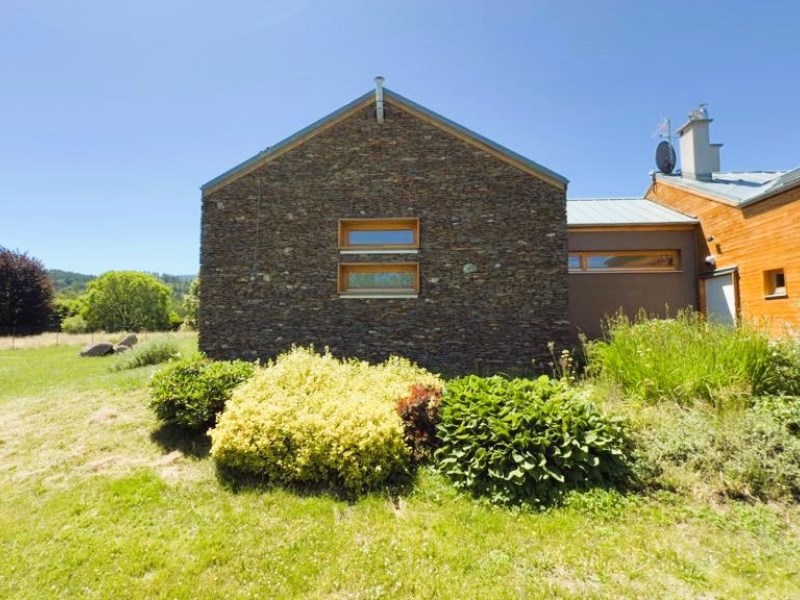 Elewacja wschodniego skrzydła budynku została wykonana z naturalnego łupka serycytowego grubości 13 cm z pustką powietrzną między dwiema ścianami muru.Pozostałe ściany wykończone są tynkiem szlachetnym.