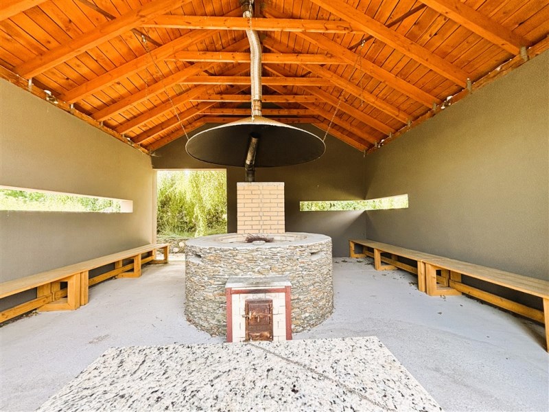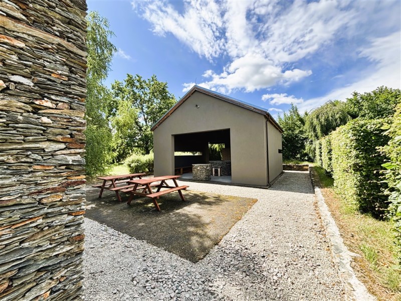 Pawilon biesiadny o powierzchni 34,09 m2 z grillem i wędzarnią i ławami do siedzenia wyposażony w oświetlenie ledowe i energię 230 V.