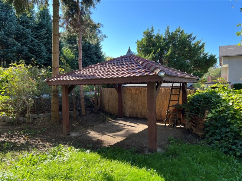 Na ogrodzie znajduje się duża wiata drewniana pokryta dachówką. Świetne miejsce na grilla oraz do spędzania wolnego czasu z rodziną i znajomymi. Na pierwszym piętrze mamy możliwość zrobienia dużego balkonu, który znajduje się od najlepszej strony świata- południowo-zachodniej. Dużym atutem jest również obszerny parking na przeciwko tej nieruchomości.