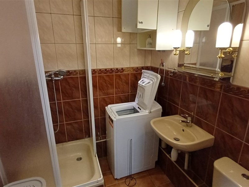 - łazienka z kabiną prysznicową, WC, umywalką oraz pralką