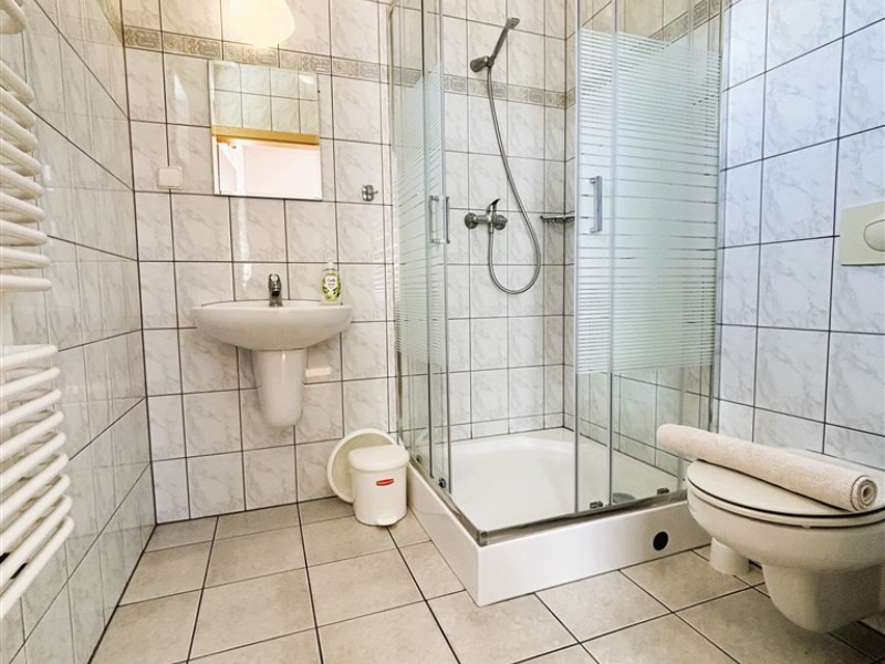 Wnętrze domu o wysokości pomieszczeń 3 m mieści się w całości na jednym poziomie i obejmuje 8 pokoi, 6 łazienek, kuchnię, hol oraz pomieszczenia techniczne. Panoramiczne okna oraz drzwi wejściowe wykonano w systemie Schüco, z trzyszybowym pakietem szybowym, co gwarantuje komfort akustyczny i energetyczny. Budynek ogrzewany jest piecem gazowym firmy Buderus oraz grzejnikami ściennymi. Pojemny zbiornik ciepłej wody (300 l) zapewnia wysoką wydajność użytkową.