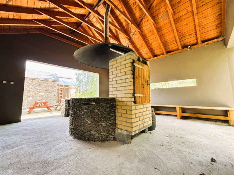 Pawilon biesiadny o powierzchni 34,09 m2 z grillem i wędzarnią i ławami do siedzenia wyposażony w oświetlenie ledowe i energię 230 V.