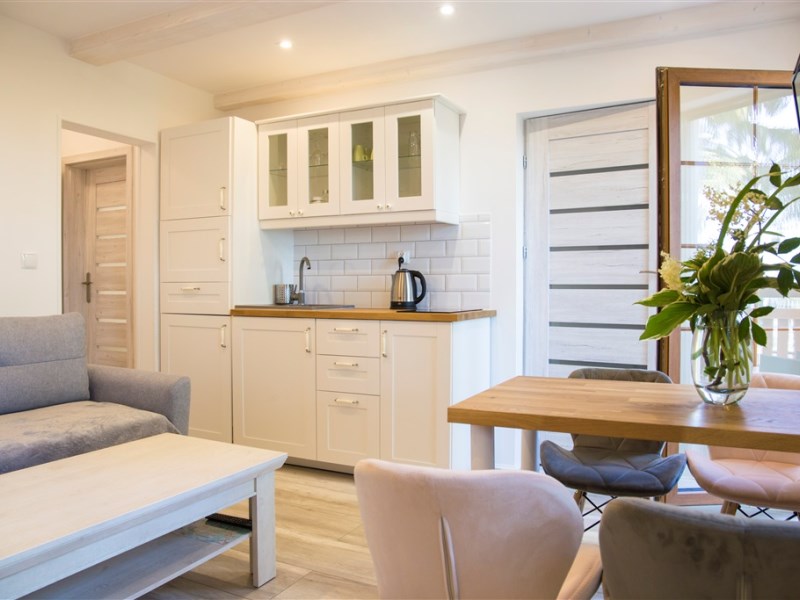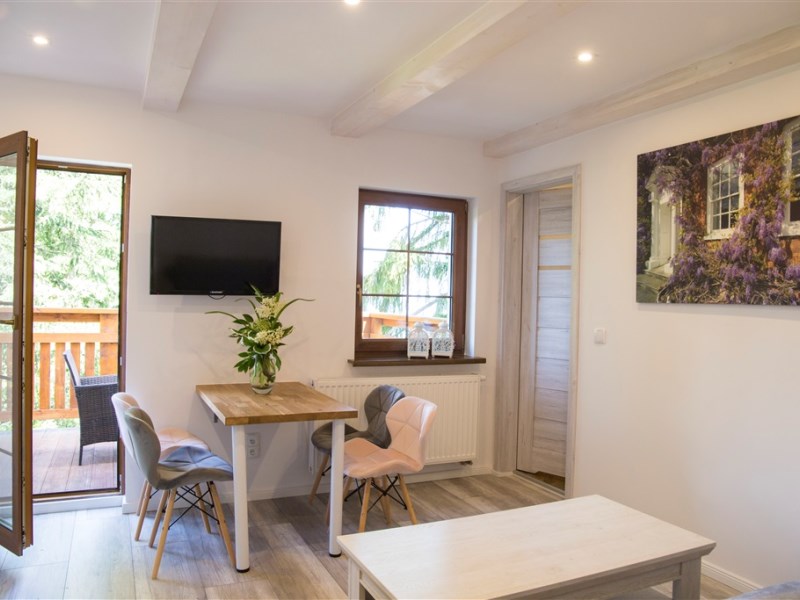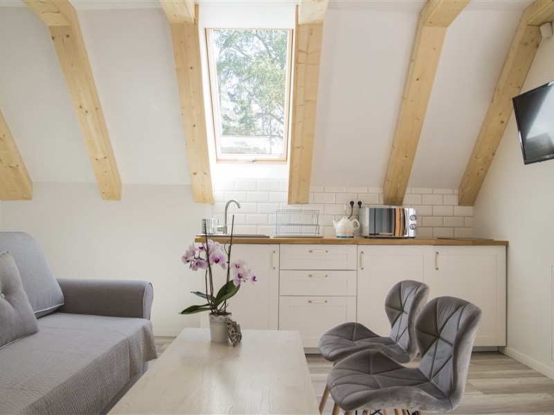 - apartament 6-osobowy, 45m2 składający się z salonu z 2-osobową sofą i aneksem kuchennym,